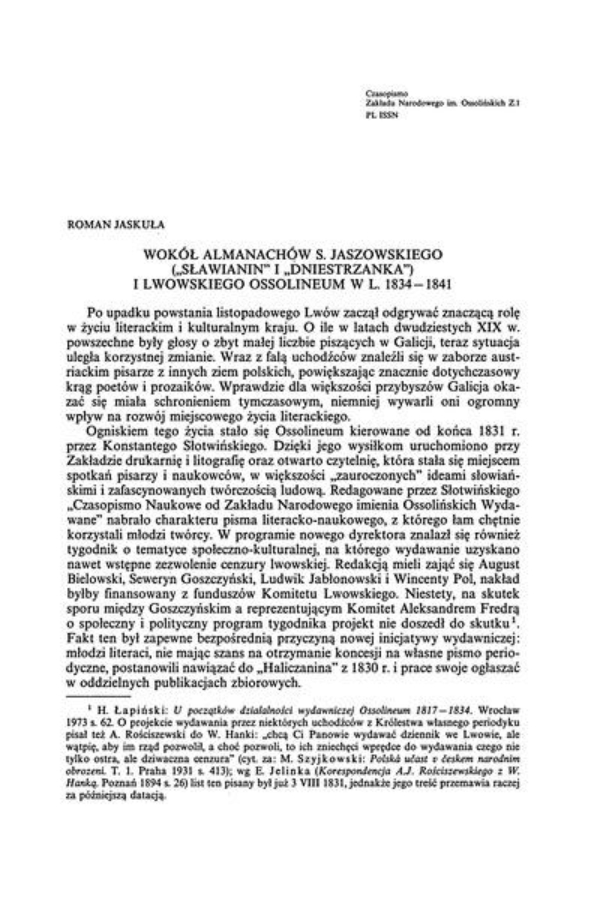 Czasopismo Zakładu Narodowego imienia Ossolińskich. Zeszyt 1