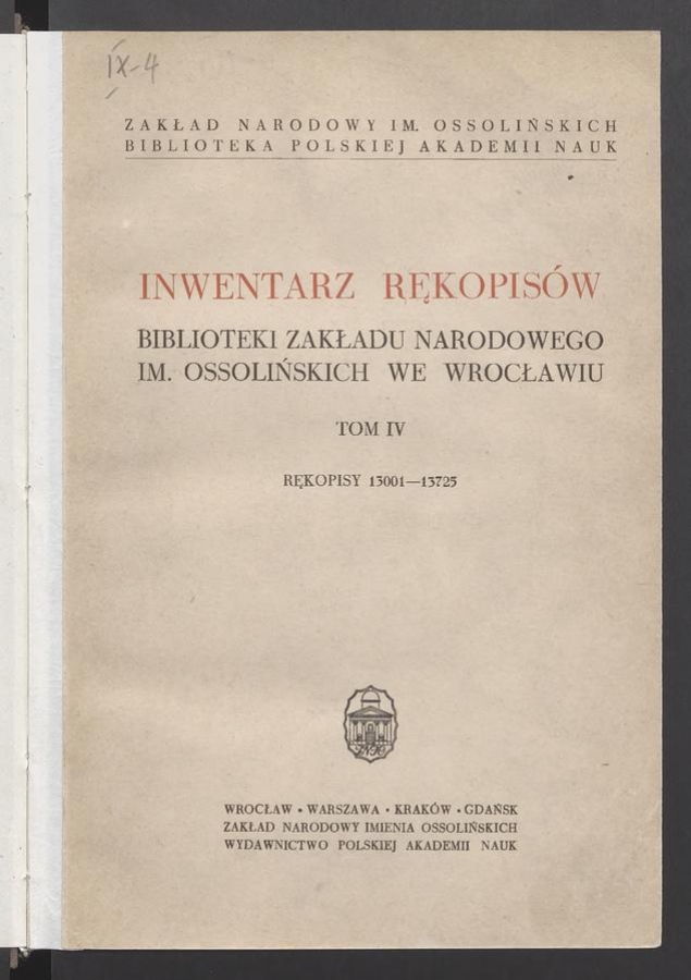 | Inwentarz rękopisów Biblioteki Zakładu Narodowego im. Ossolińskich we Wrocławiu. Tom 4, Rękopisy 13001-13725 | Sep 11, 2025 |