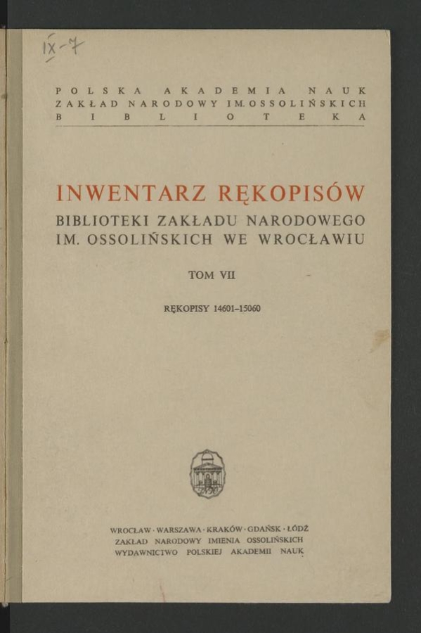 | Inwentarz rękopisów Biblioteki Zakładu Narodowego im. Ossolińskich we Wrocławiu. Tom 7, Rękopisy 14601-15060 | Sep 11, 2025 |