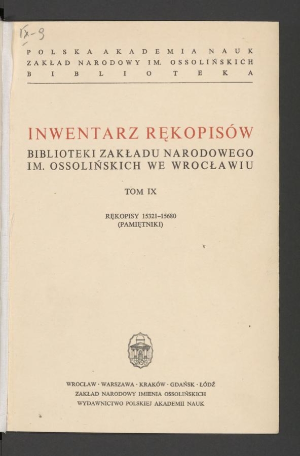 | Inwentarz rękopisów Biblioteki Zakładu Narodowego im. Ossolińskich we Wrocławiu. Tom 9, Rękopisy 15321-15680 : Pamiętniki | Sep 11, 2025 |